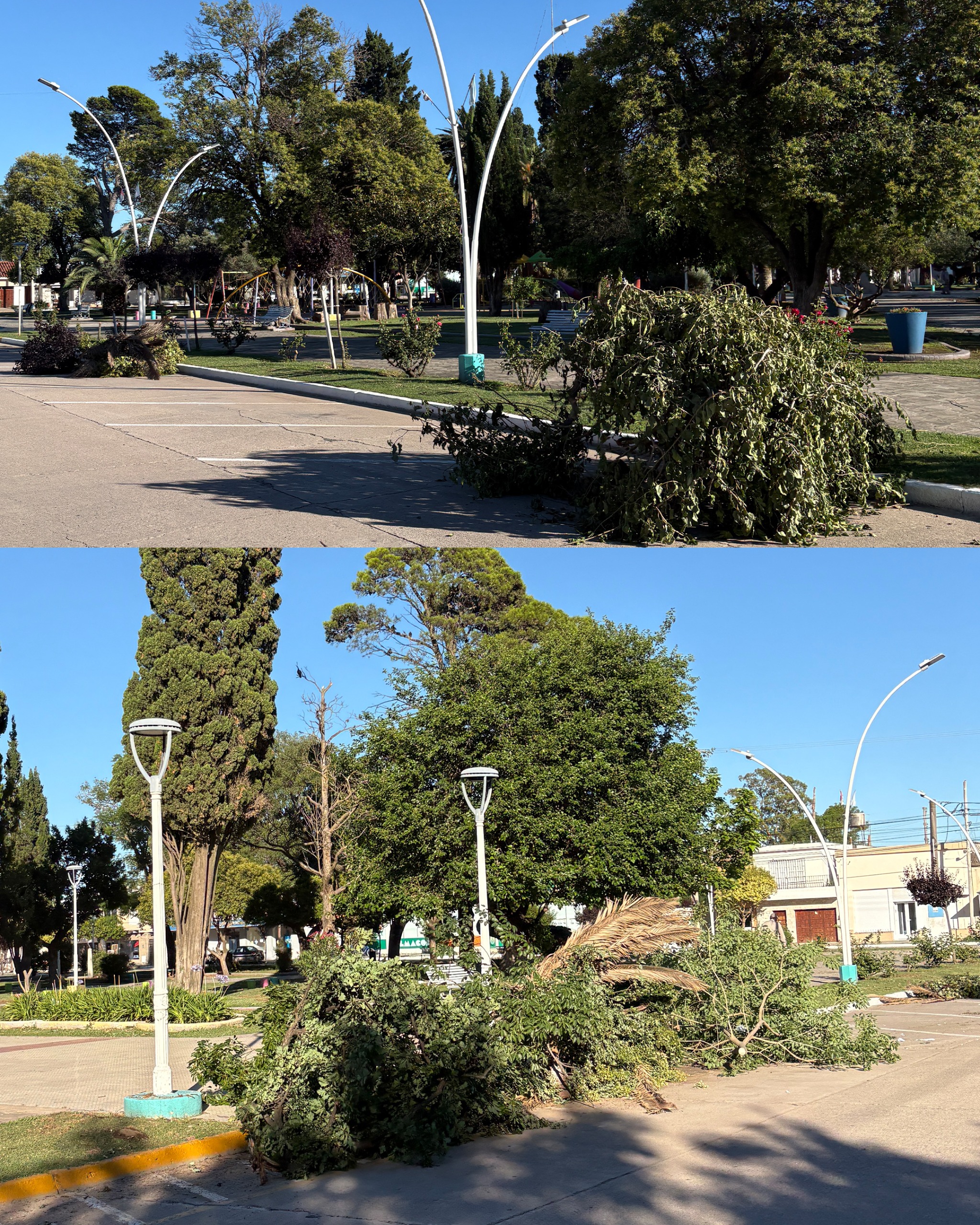 Los trabajos estuvieron centrados en extracción de plantas caídas, limpieza de las plazas, retiro de ramas y el recupero de calles de tierra más afectadas por el temporal.
